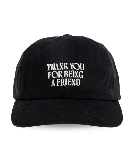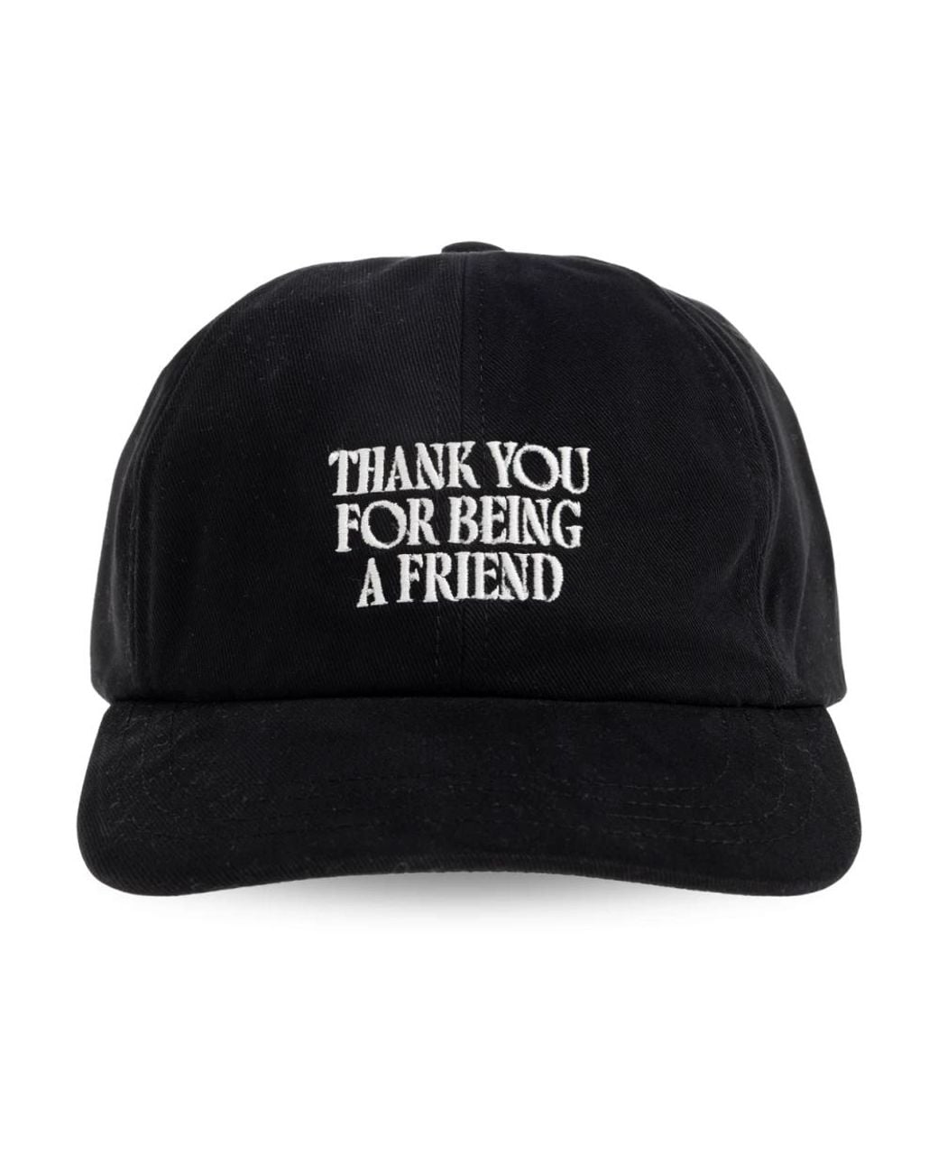 Ami Paris Baseball Cap pairs minimalist six-panel construction with a distinctive white embroidery that reads "Thank YOU FOR Being A Friend". Made from ribbed cotton with an adjustable buckle and curved brim, it offers comfortable, versatile everyday wear. Key attributes: Black | Cotton | Comfortable wear | Durable construction | Adjustable buckle closure | Curved brim | Six-panel construction | Visible seams | White front embroidery reading "Thank YOU FOR Being A Friend" | Back heart emblem with letter "A" | Dimensions & fit: Visor: 6.5 cm | Classic fit | Composition & care: 100% cotton Color: black