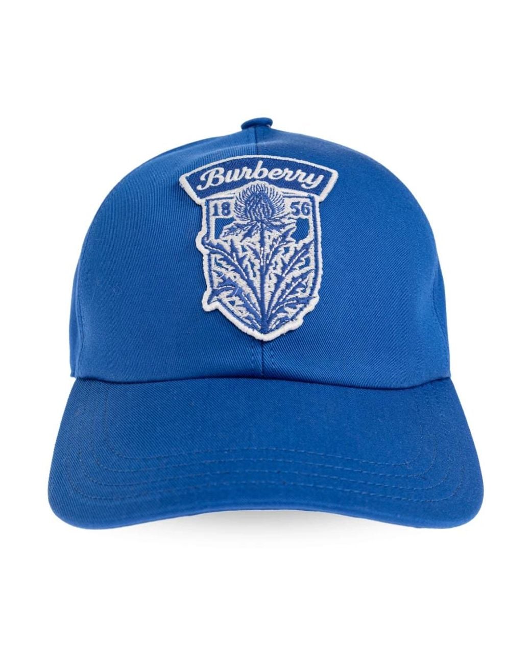 Burberry Thistle Shield Gabardine Baseball Cap combines a structured baseball silhouette with a curved visor and an embroidered thistle shield badge for refined everyday wear. Crafted in cotton gabardine and finished with a metal B buckle strap, it offers a tailored, adjustable fit. Key attributes: Damson blue | Cotton | Adjustable metal buckle closure | Herringbone cotton lining | Structured baseball silhouette | Curved visor | Appliquéd embroidered badge with thistle shield and logo | Precision stitching | Dimensions & fit: One size with adjustable strap | Adjustable circumference via metal B buckle | Composition & care: Outer: 100% cotton | Lining: 100% cotton Color: blue