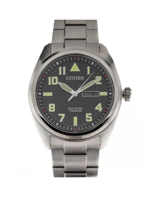 Citizen Super Titanium Watch pairs Citizen's Eco-Drive solar movement with a durable titanium case and bracelet for reliable everyday wear. It’s built with a sapphire crystal and 10 ATM water resistance for everyday activities and light water exposure. Key attributes: Black | Nero e titanio | Titanio | Eco-Drive (solar-powered) | Water resistant to 10 ATM | Sapphire crystal | Day-date display | Luminous hands and markers | Fold-over clasp with push buttons | Black dial | Arabic numerals and index markers | Titanio case and bracelet finish | Dimensions & fit: Case diameter: 42 mm | Composition & care: Titanio | Zaffiro | Wipe with a soft cloth. Avoid prolonged contact with chemicals and extreme temperatures. Have serviced by an authorized service center as needed. Color: metallic