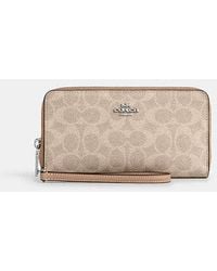 Go to Coach OutletPrinted coated canvas and smooth leather 12 credit card slots Full-length bill compartments Inside zip coin pocket Zip-around closure Detachable wrist strap 7 1/2 (L) x 4 (H) x 1 (W) Fits all