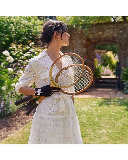 <p><strong>A wrist-length day glove in Pure Supima Cotton, finished with a contrast keyhole and bow at the cuff.</strong></p><p>Our cotton starts life in California's San Joaquin Valley — one of the few places that grows true Supima — then travels to Fehraltorf in Switzerland, where it's knitted into a cotton jersey that is light, breathable, and rated UPF 50. It drapes cleanly without going limp, holds its shape through a long day, and feels cool against the skin even in full sun.</p><p>Annabel is a glove with a quiet point of view. The two-tone keyhole and bow give it just enough detail to catch the eye without competing with whatever else you're wearing. At wrist length, it slips on and off easily — the kind of glove you throw in your bag for a race day, a summer christening, or a lunch where you'd rather not arrive bare-handed.</p><p>Handmade by us in England. A warm-weather staple that earns its place in the drawer.</p> Color: black