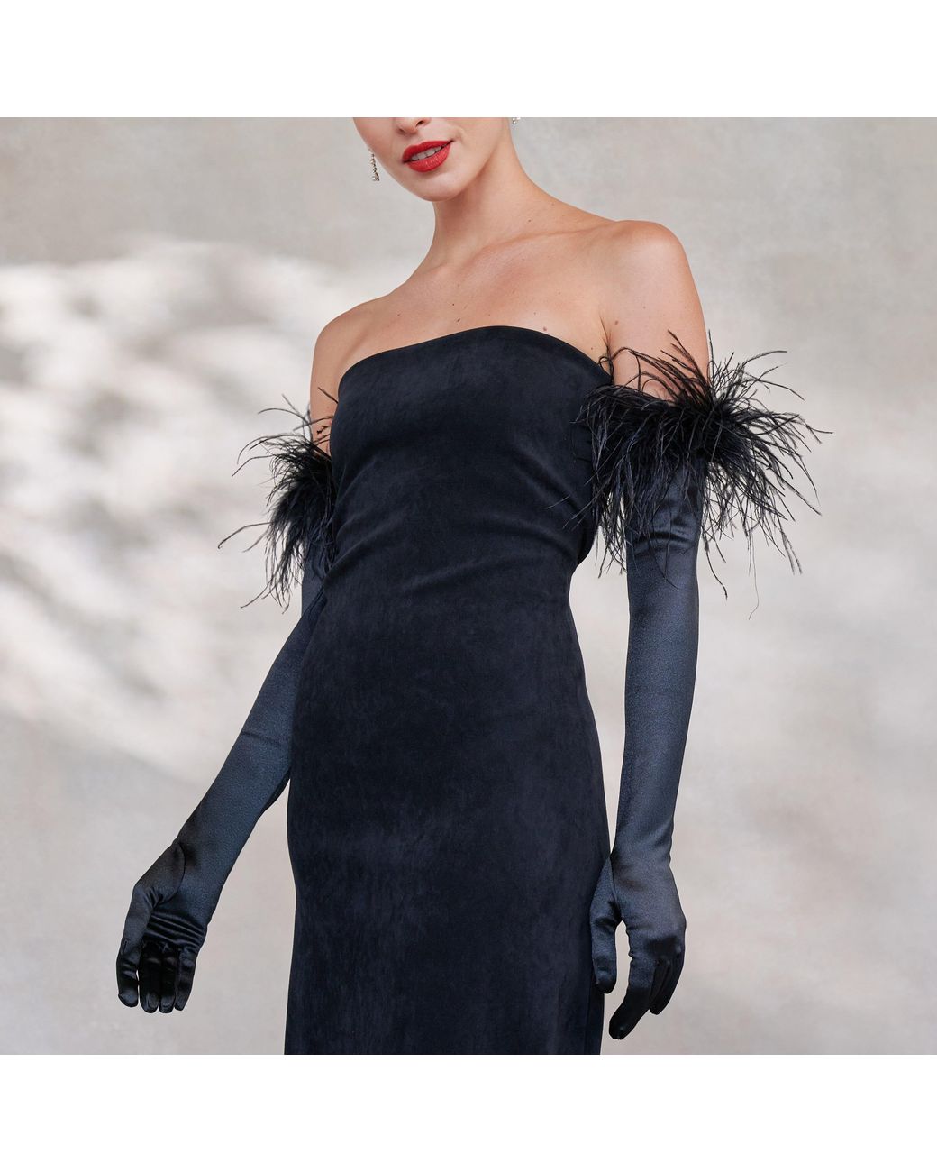 A long evening glove in satin, finishing above the elbow and trimmed with ostrich feathers. An exercise in pure glamour for the big event. There is really nothing quite like Ostrich feathers when you need to conjure up a sense of occasion. Color: black