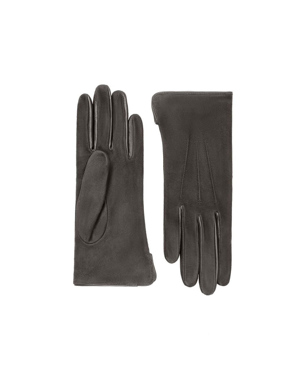 Sometimes you can't improve on a classic and Esmée is the living proof. A short glove in suede with three points on the back of the hand, fourchettes and welt in leather to provide a dash of contrast. Fashion is for the moment, true style is forever. Lined in pure silk. Color: gray