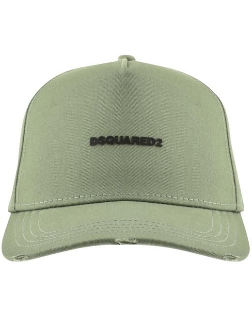 DSQUARED2 Mini Logo Cap In Light Military Green. A six panel baseball style hat with a stiff front peak and an adjustable branded silver buckle fastening strap on the reverse. The signature DSQUARED2 logo is rubberised on the front of the cap and embroidered text above the strap. Embroidered eyelets feature around the crown for ventilation. 100% Cotton. Color: green
