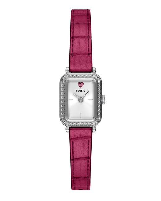A silver-tone rectangular case frames a sleek silver sunray dial. A red heart-shaped stone on the dial adds a charming, distinctive touch that makes this watch truly special. The smooth pink leather strap lends a soft, understated finish, secured with a single-prong buckle for easy adjustability. Color: pink