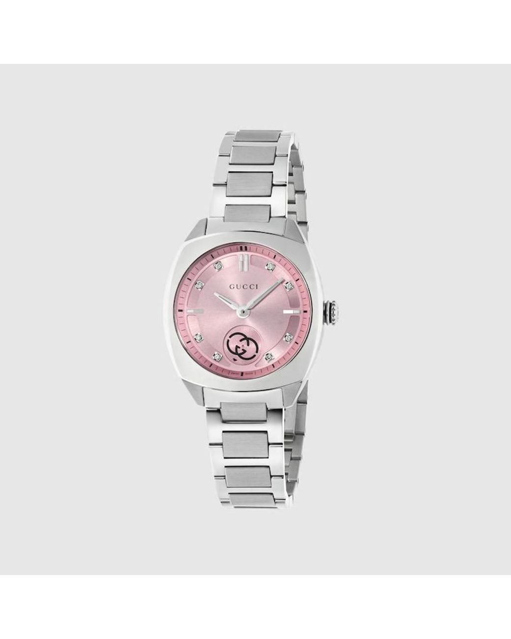 Powered by a quartz movement, the new Gucci Interlocking watch combines the historic codes of the House with a contemporary feel. The style in 29mm case offers a pink dial with diamonds. Finished with a stainless steel bracelet, the accessory is enriched with the signature Interlocking G logo in a small seconds display. 29mm stainless steel case, pink dial with 8 diamonds, Interlocking G small seconds display, stainless steel bracelet, Sapphire glass with antireflective coating, The warranty certificates for Gucci watches purchased after March 1st 2022 are exclusively available online. Download your certificate at https://watchwarranty.gucci.com by using the serial number engraved on the back of your watch. , 5 ATM (50 meters/164 feet), Quartz movement, Wrist size from 5.1" to 7.5", YA142511, Swiss Made