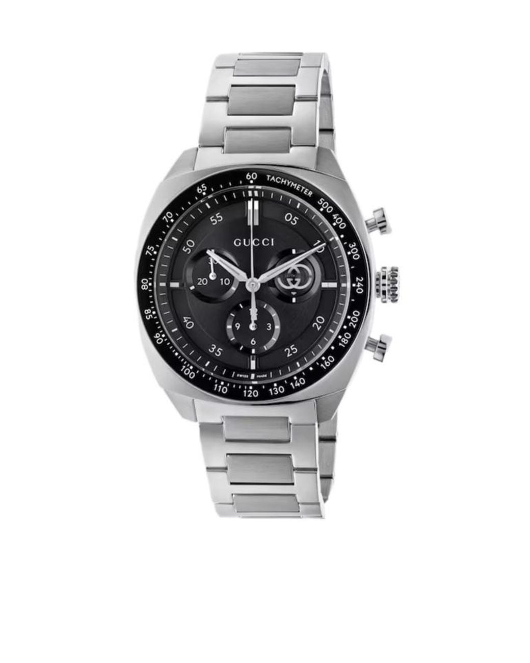 The small second hand display is decorated with the iconic Interlocking G logo, a black dial, and a black ceramic bezel with tachometer indications. Color: gray