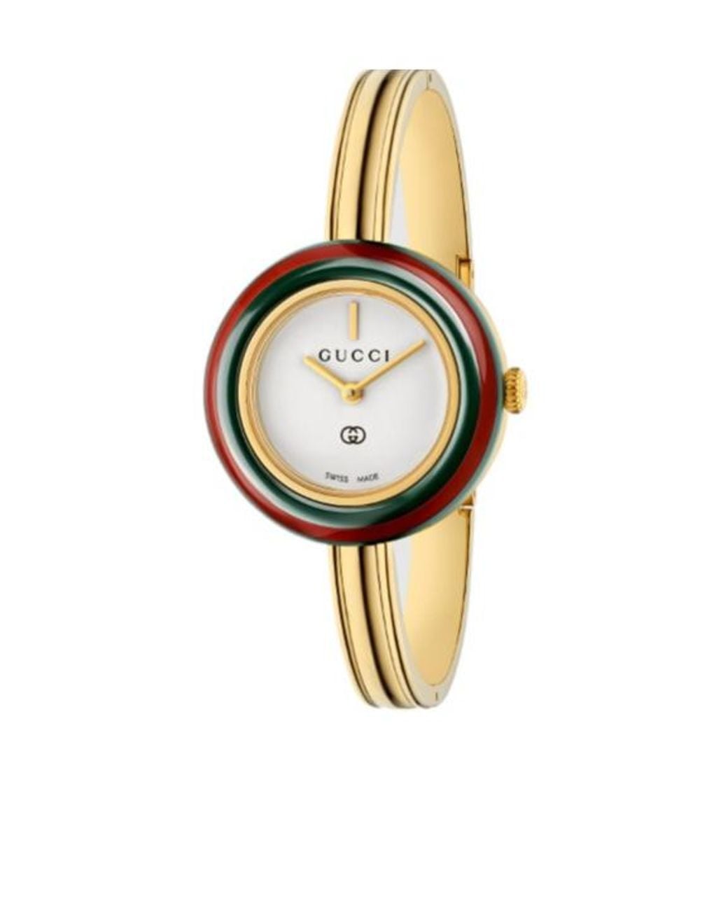 28 mm yellow gold-toned stainless steel case with 7 interchangeable ceramic bezels White dial with Gucci logo and Interlocking G detail Sapphire glass with anti-reflective coating Yellow gold-toned bangle Color: metallic