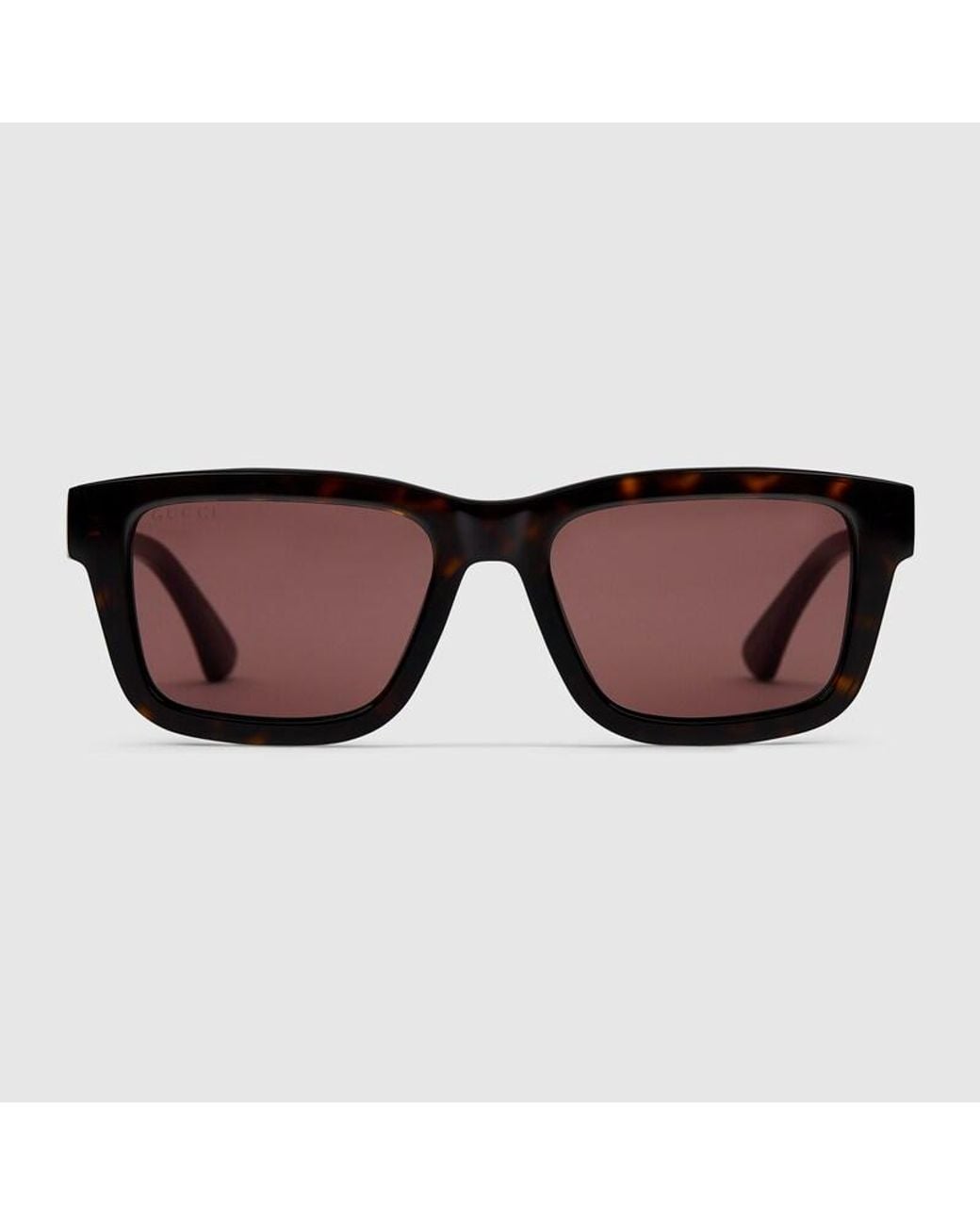 The Cruise 2025 eyewear collection blends a sleek silhouette and signature motifs in a contemporary design. These rectangular sunglasses with green and red temples feature a Gucci logo. Brown tortoiseshell acetate, Shiny blue and red injection temples with Gucci logo, Solid brown lens, 100% UVA/UVB protection, GG1869S, Temple length: 5.7", Lens height: 1.5", Nose bridge length: 0.7", Frame height: 1.9", Frame width: 5.7", Hinge to hinge: 5.2", Made in Japan, The eyewear case in the House's signature Gucci Rosso Ancora red hue is complete with a magnetic closure and white interior. Color: brown