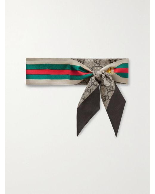 Gucci's scarf is made from silk-twill featuring different patterns on each side - you can wear it with either the iconic 'GG' monogram showing, or reveal the signature red and green stripes and horsebit motif. Tie yours around your favorite bag or wear it as a headband.