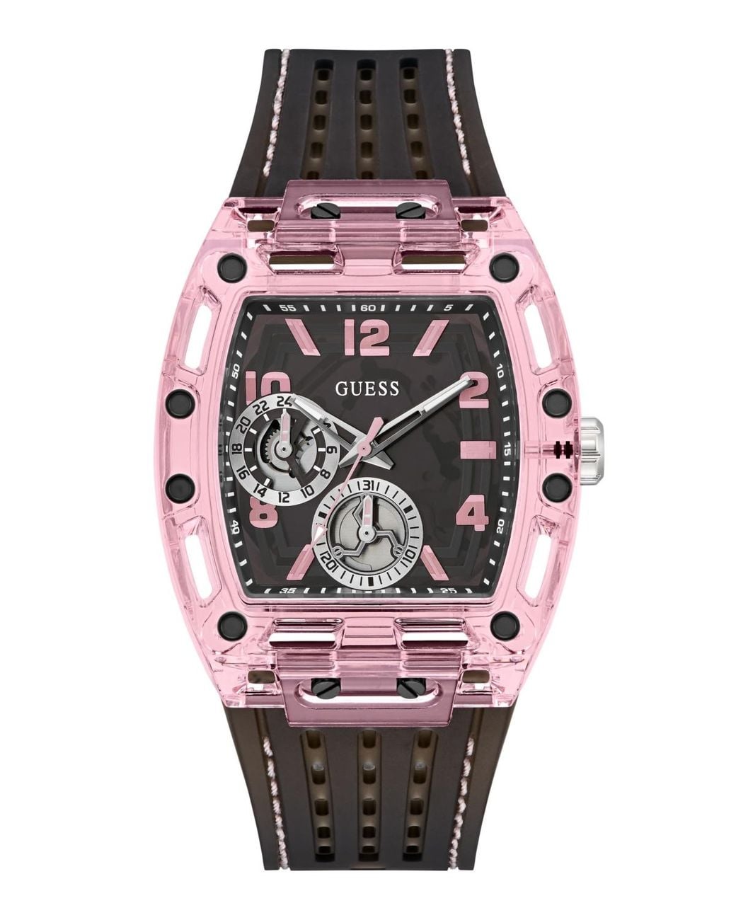 Show your support for Breast Health Awareness with this year's timepiece, featuring a transparent black multi-function dial and a cut-thru transparent light pink polycarbonate case. A milky black transparent silicone strap with perforation and pop pink stitching completes the look. Color: pink