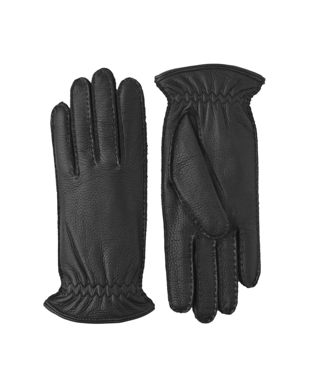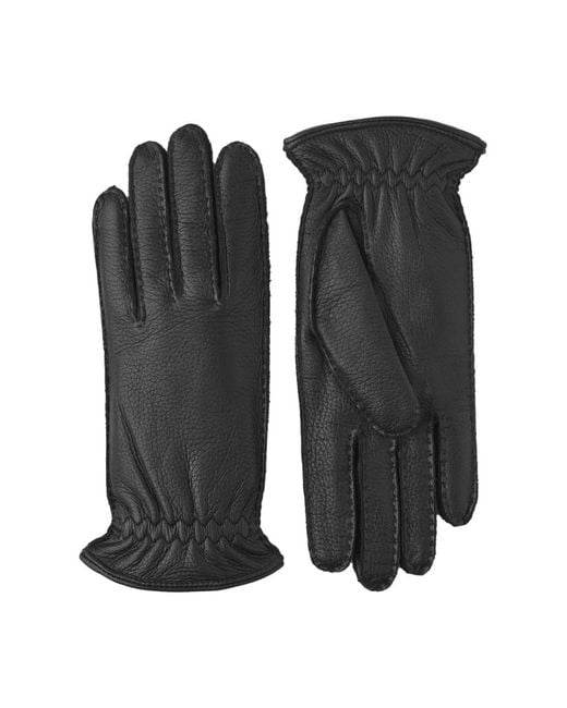 Introducing the Hestra 20920 Montgomery Elk Gloves in black. These hand-sewn gloves are crafted from high-quality Scandinavian elk leather, tanned by renowned German tanneries. Designed for men, these gloves feature a luxurious 100% cashmere lining, knitted in Italy for ultimate softness. The timeless style is accentuated by the hand-sewn seams and elastic wristband. Arriving in a premium sturdy box, these gloves are a must-have for cool autumn and winter days. Color: black