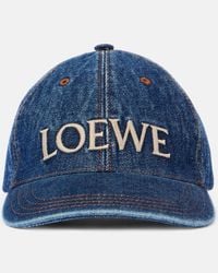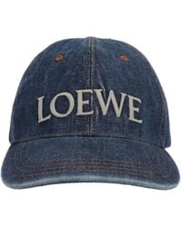 Go to ItalistLoewe Denim Blue Cotton Denim Cap. Denim blue cotton cap, six-panel construction, front contrasting white embroidered logo, tonal visor, back tonal adjustable strap, back brown calf leather logoed patch, contrasting brown stitching. Color: