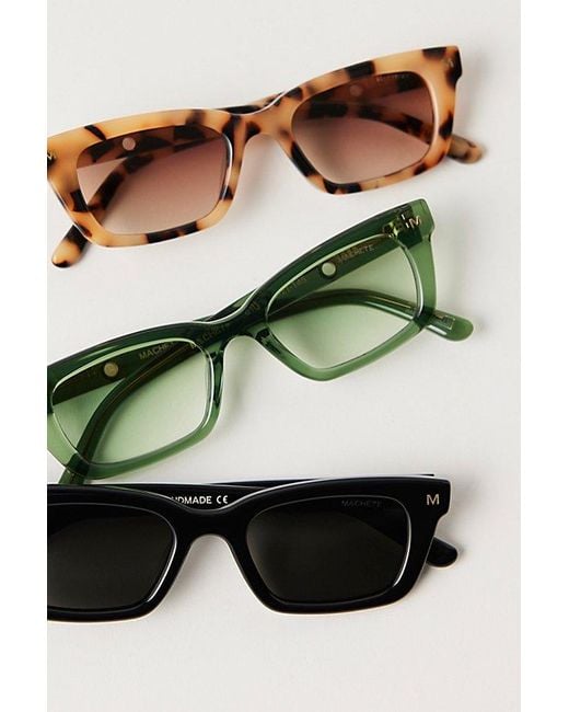 Add a ‘90s-inspired touch to your look with these acetate sunglasses, featuring graphic logo detailing and a flattering winged shape. **Features:** Rectangular frames, tinted UV 400 protected lenses, saddle nose bridge, logo detailing on fronts and temples, thin, tapered arms, comes with a box and soft case **Why We ❤ It:** Perfect for lounging poolside, running errands, and everything in between. Machete The Ruby Rectangle Sunglasses at Free People in Black Color: green