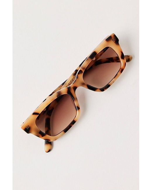 Add a ‘90s-inspired touch to your look with these acetate sunglasses, featuring graphic logo detailing and a flattering winged shape. **Features:** Rectangular frames, tinted UV 400 protected lenses, saddle nose bridge, logo detailing on fronts and temples, thin, tapered arms, comes with a box and soft case **Why We ❤ It:** Perfect for lounging poolside, running errands, and everything in between. Machete The Ruby Rectangle Sunglasses at Free People in Blonde Tort Color: multicolor