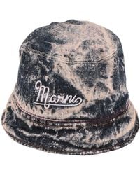 Go to YOOXMARNI. bucket hat, denim, distressed, faded, tie-dyed, embroidered logo, medium brim, fully lined, do not wash, do not bleach, do not tumble dry, do not iron. 100% Cotton. Color: gray