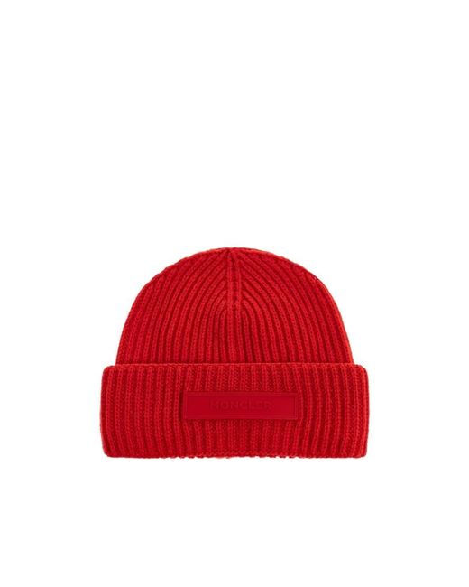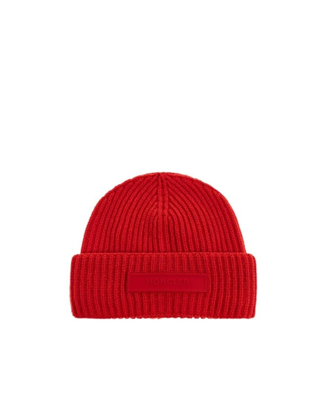 The front is detailed with a designer logo and features ribbed knit and cuffed edges. Color: red