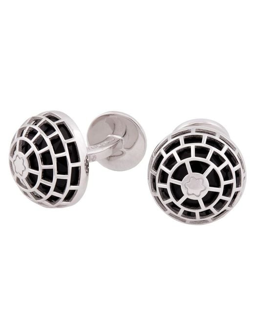 Montblanc Mens Cufflinks. SKU: 128399. Barcode: 4062037055428. Color: Silver. Montblanc Meisterstuck Onyx Stone Cufflinks. Crafted from polished silver, the Montblanc Meisterstuck cufflinks feature a sleek, contemporary dome design accented with a black onyx stone and the iconic engraved Montblanc emblem. Adding to their refined detail, the back of each cufflink is also adorned with a round onyx stone for a sophisticated finish. Made in Italy.