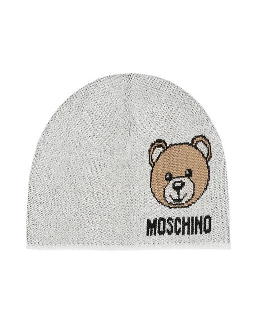Gray hat from Moschino. Crafted from silver-tone lurex yarn blend, this piece of headwear displays the labels iconic Teddy bear motif and logo in brown and black. Color: gray