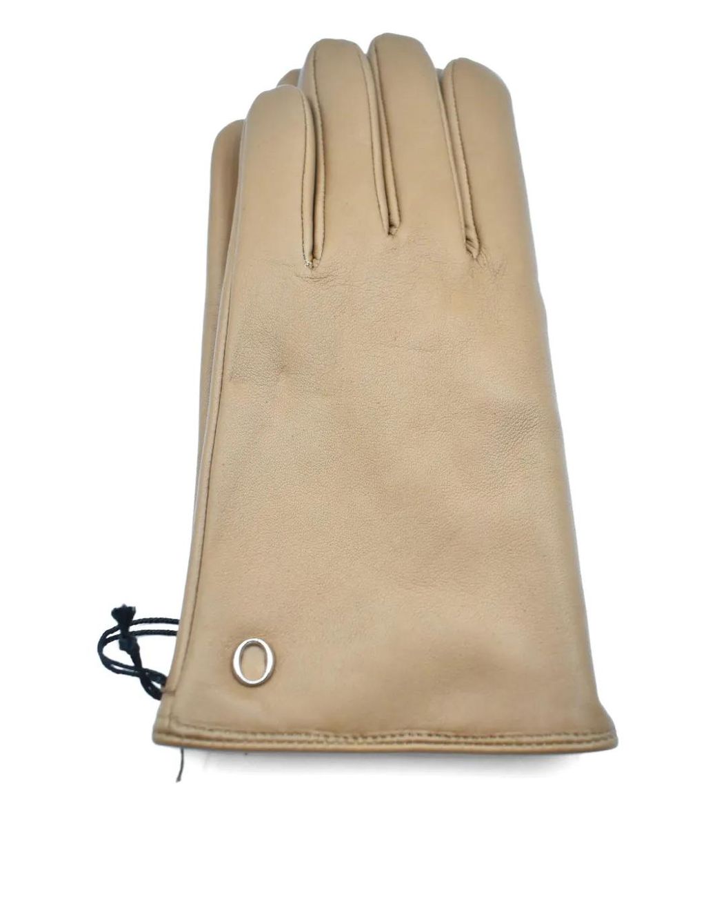 Light brown five finger design pull-on style stitched detailing logo accent elasticated cuff Size: 7. Gender: Female. Material:Calf Leather. Color: natural