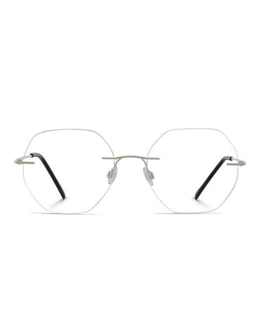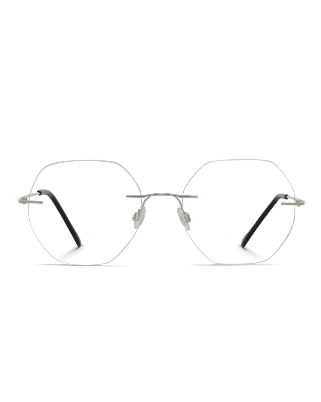 Ottoto Dimension Silver - Price includes high quality frames, standard prescription lenses, shipping, free case and cloth. Small Silver Rimless. These Geometric shaped eyeglasses are great for Oval/Round shaped faces. Only $98. Color: black