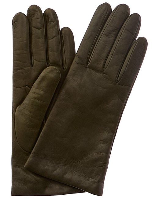 About the brand: Cozy cashmere and other cold-weather staples. Color/pattern: laurel Measures 9.5in from fingertip to hem Shell: 100% leather Lining: 100% cashmere Dry clean only Imported Please note: All measurements were taken by hand and are approximate; slight variations may occur. Color: green