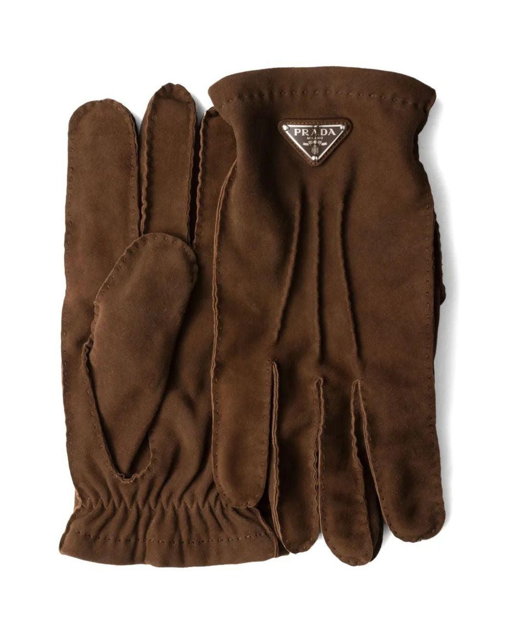 Suede gloves with enameled triangle logo and cashmere lining.SpecificationValueSeasonSS26Composition100% LAMB LEATHER; LINING: 100% CASHMEREColorF0324 CACAOColor CodeF0324_CACAOMade InITALYISOITDepartmentMenSectionACCESSORIESSubsectionGLOVESSize InformationGLOVESSize CodeGLOVES Color: brown