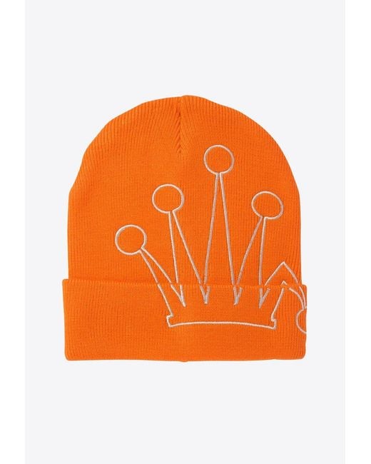 Cuff Crown Embroidered Ribbed Beanie - Orange