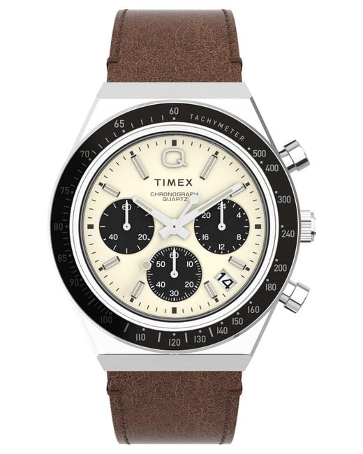 Roar across the finish line with our high-performing Q Timex Chronograph. Inspired by the original motoring watches that graced the tracks of Europe's most iconic races, this timepiece celebrates the endurance of our legendary 1970s Q Timex. An ultra-precise chronograph movement and black tachymeter bezel recreate the finesse and function of a true racing watch, allowing you to determine elapsed time and average speed like the greatest daredevils in motorsports. Contrasting sub-dials, a date feature, hand-applied dimensional indices, and an updated Q Timex logo smolder against a cream dial, while a brushed and polished stainless-steel case and crown bring dynamism and durability to its retro construction. Infinitely wearable, a brown leather strap with quick-release spring bars makes for a sporty presentation that's ready to hit the road whenever you are. Color: metallic