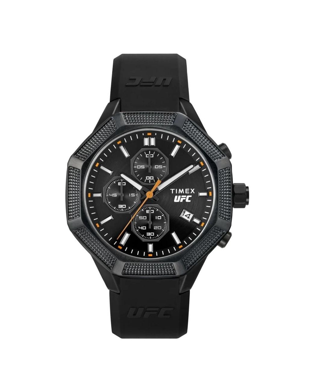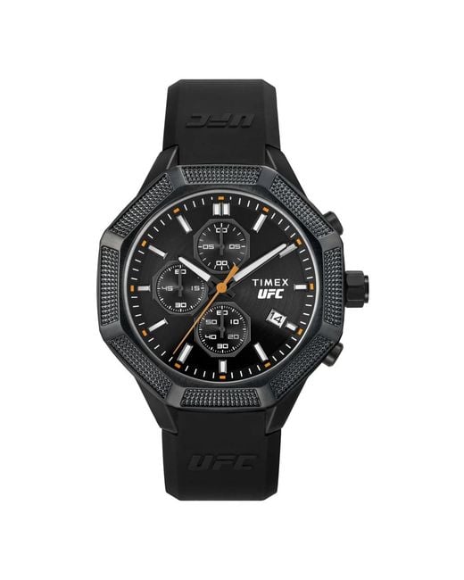 Upgrade your accessory game with the Timex UFC King watch for men. This sleek timepiece features a black analog dial, hardened mineral glass, stainless steel case, and a black silicone strap with a buckle closure. With a 45mm diameter and 13.0mm case height, this watch is water-resistant up to 100 meters. The chronograph function, 24-hour display, and luminous hands make it both stylish and functional. Delivered in a Timex packaging, this watch is a must-have for any modern man. Color: black