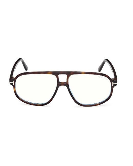 Tom Ford Blue Block Navigator Optical combines a slim navigator/aviator silhouette with blue-block lenses for everyday wear and screen protection. The acetate frame and metal T detail deliver a refined, modern look. Key attributes: Dark havana | Acetate | Blue-block lenses | Full-rim frame | Navigator silhouette | Shiny acetate finish | Metal T logo detail | Dimensions & fit: Lens width: 57 mm | Bridge width: 13 mm | Temple length: 140 mm | International fit | Composition & care: Acetate Color: brown
