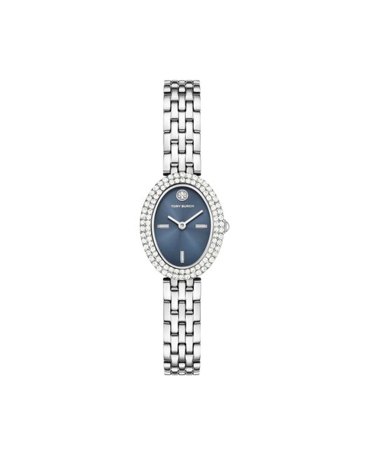 Delicate and jewelry-like, a blue dial is set within an oval-shaped case, outlined in pavé embellishments. The elegant design is complemented by a classic link bracelet and crafted in silver-tone stainless steel. Dial: Oval silver stainless steel case with a sunray blue dial. Watch Band: Silver durable stainless steel bracelet; links can be removed for a customized fit. Water Resistant: Up to 30m (100 ft): Will withstand splashes or brief immersion in water, but not suitable for swimming or showering; 3 ATM. Color: blue