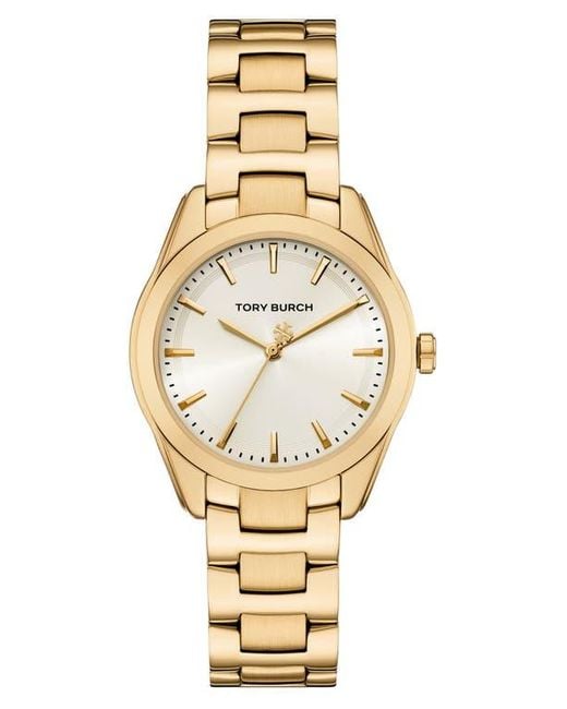 Marked by simple elegance and subtly integrated Tory Burch iconography, this version of the Miller watch makes a polished impression in a two-texture allover-goldtone design.Measurements: 34mm case; 7.7mm case depth; 16mm band width.Strap/closure: Bracelet strap with deployant clasp closure.Movement: Three-hand Japanese quartz movement. Quartz movement: powered by a battery and features an internal electrical circuit to control the rate of the watch's ticking.Other features: Sunray-guilloche dial.Face: Mineral crystal face. Color: metallic