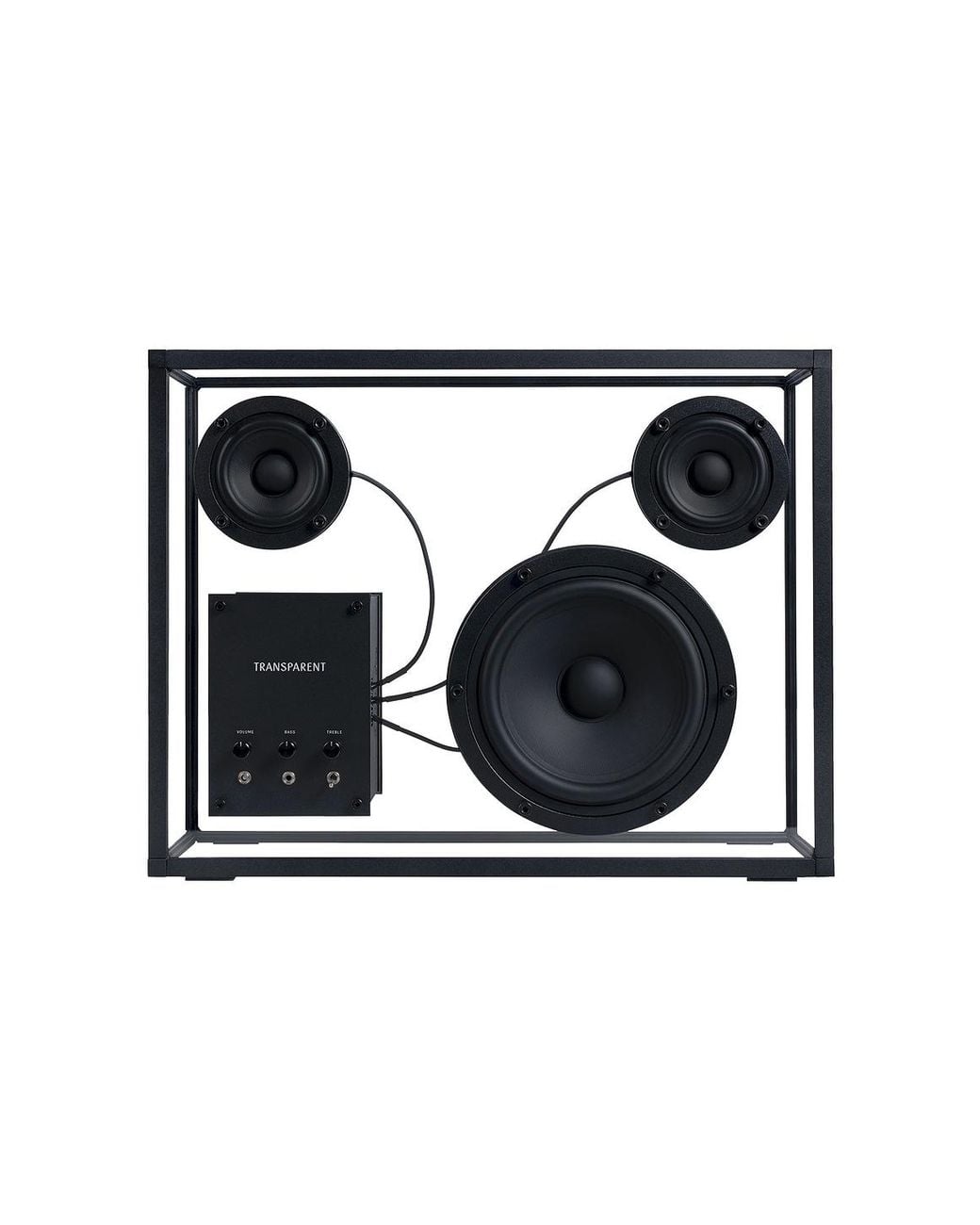 Transparent Speaker in Black The large Transparent Speaker gives a powerful yet balanced sound that fills any room. Crafted from aluminum and tempered glass, this speaker is designed to be as much an interior object as a great piece of technology. Comes with BluetoothTM5.0 but it is also ready for whatever tech that might be useful in coming years. An aspiration to become better over time.. Made in China. The Transparent Speaker comes with Bluetooth 5.0 connection. Includes white cotton gloves, long and short audio cables, power cables (mains and USB), and wall mount (brackets and screws). Measures approx 13 W x 7 H x 4.6 D. TSPF-WH3. TS-B-B. About the designer: Color: black