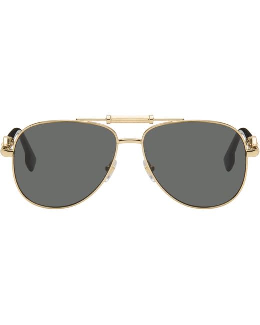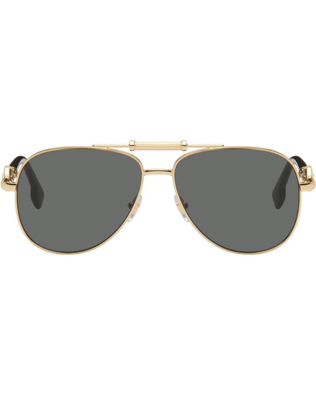 Aviator-style metal-frame sunglasses. · Gray lenses · 100% UVA/UVB protection, category 3 · Adjustable rubber nose pads · Fluted top bar · Logo hardware at temples · Black acetate trim at temple tips · Includes case · Size: 59.14 140 Supplier color: Gold/Black