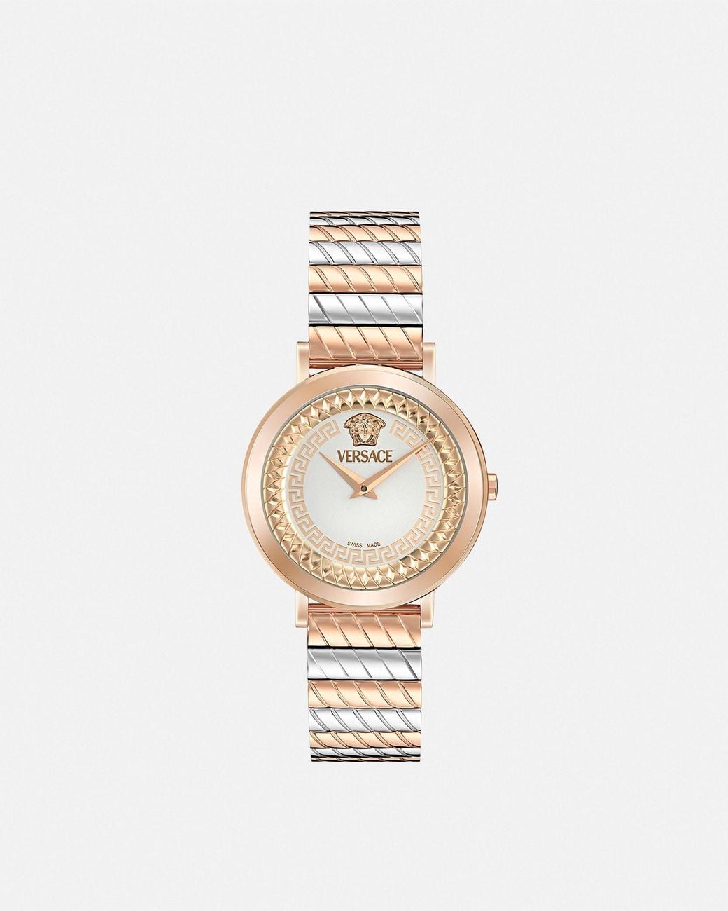 The Delphinus watch blends heritage with modernity. An all-over chain motif provides intricate depth to the inner dial, while a distinctive Greca motif features on the mid-dial. The lugs frame the dial, displaying the Versace Logo and a three-dimensional Medusa at 12 o'clock. All Versace watches are guaranteed by the 'Swiss Made' marking. All stainless steel is recycled. Color: white
