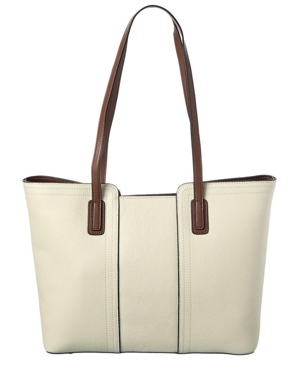 Color/material: creamy white and brown leather Measures 15.5in wide x 10.5in high x 4.5in deep Shoulder straps drop 13in Zipper closure Imported Please note: All measurements were taken by hand and are approximate; slight variations may occur.