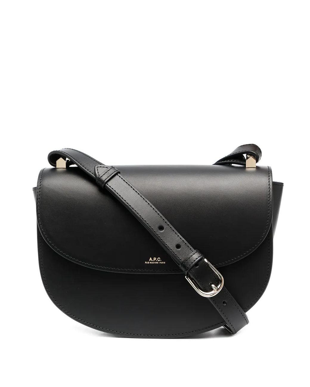 Black leather gold-tone logo lettering front flap closure curve-edge body adjustable shoulder strap Size: One Size. Gender: Unisex. Material:Leather/Cotton.