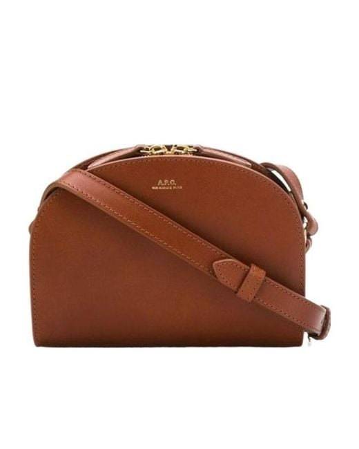 Brown half-moon shoulder bag with adjustable shoulder straps, top zipper, built-in main layering, built-in label, smooth surface with fading effect. Color: brown