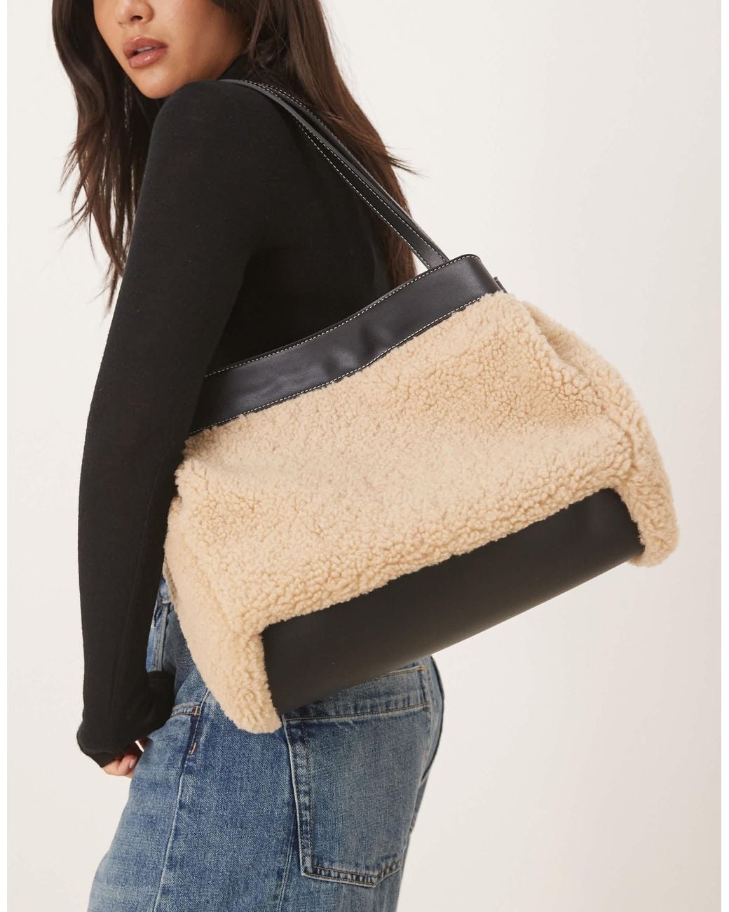 - Faux Shearling Tote With Contrast Panel