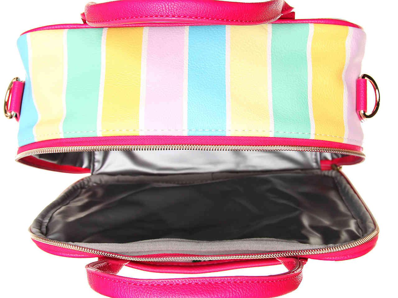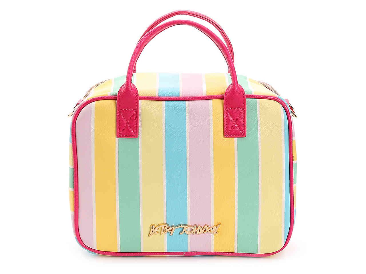 Make your lunch break something to look forward to! The Smarty Pants insulated lunch bag from Betsey Johnson is designed with tutti fruiti stripes and a playful candy graphic to make every packed meal a little bit sweeter. Printed faux leather. Wraparound zipper closure. Rolled top handles with 21⁄2" drop. Removable shoulder strap with 221⁄2" max. Drop. Exterior Pockets: 1 slip. Insulated polyester lining.