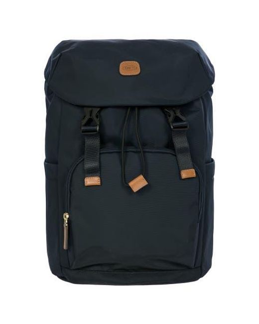 From the X-Collection, this large water-resistant backpack is made of soft, lightweight yet durable recycled fabric. The length of the straps can be adjusted for a comfortable personalised fit, while the roomy compartment ensures versatility. The two lateral pockets expand to fit the essentials, while the zip pocket on the front is also very roomy. At the back there’s a band to attach it to the handle of a suitcase, and a zip pocket designed to keep valuables and other important items secure. The main compartment is closed with a slider. The inside is also complete with numerous pockets, and a padded sleeve to hold a mini laptop or tablet. Decorated by Bric’s distinguished real leather trim, the inside is lined in fabric. Color: blue