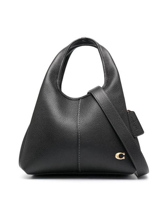 Black calf leather pebbled texture gold-tone logo plaque gold-tone hardware circular top handles detachable shoulder strap partitioned compartment internal logo patch Size: One Size. Gender: Female. Material:Calf Leather. Color: black