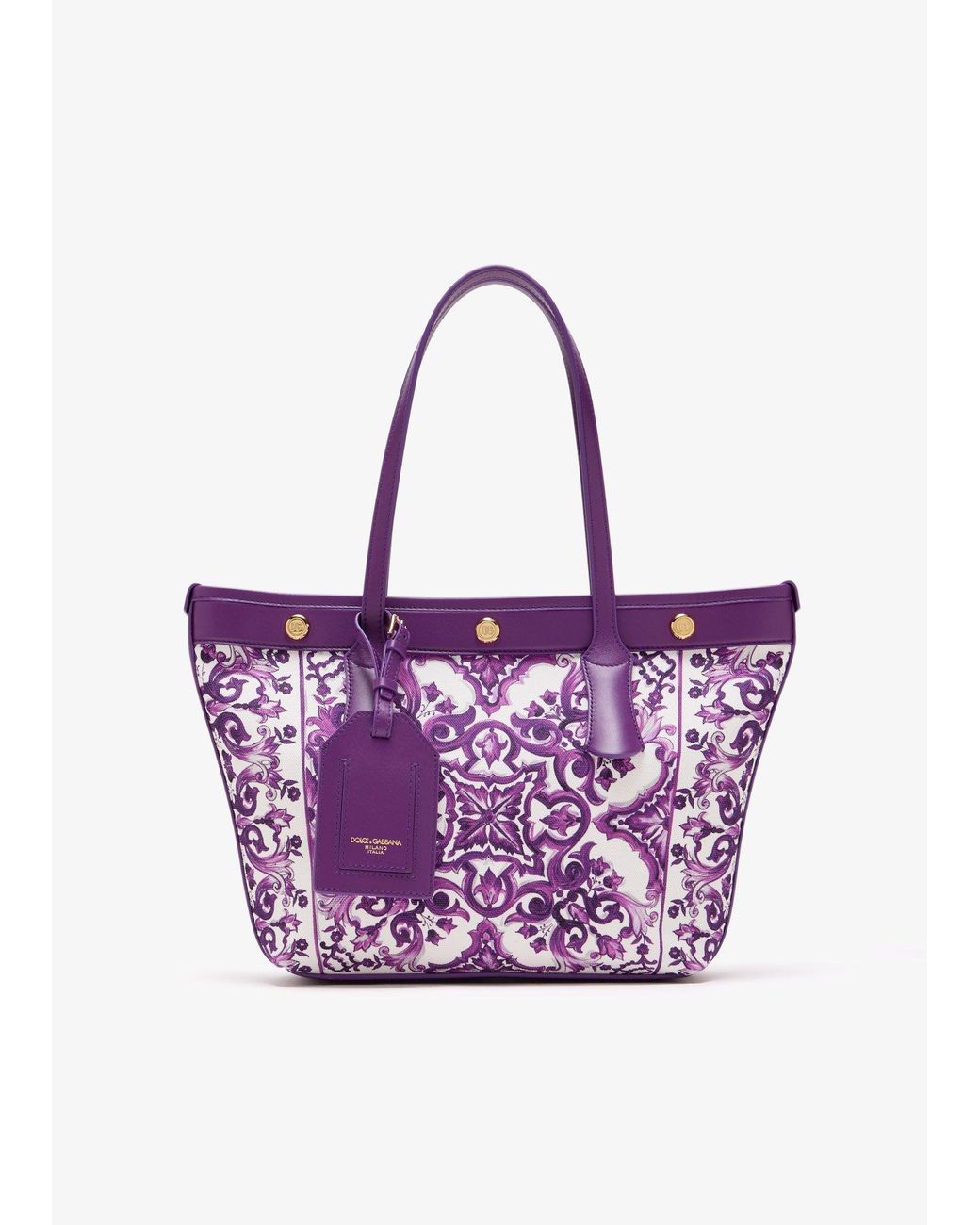 The Atene Maiolica-print tote bag captures the essence of Sicilian charm with its vibrant Maiolica print. Designed for everyday elegance, it features spacious proportions, snap closures, and a zippered pocket. Color: purple