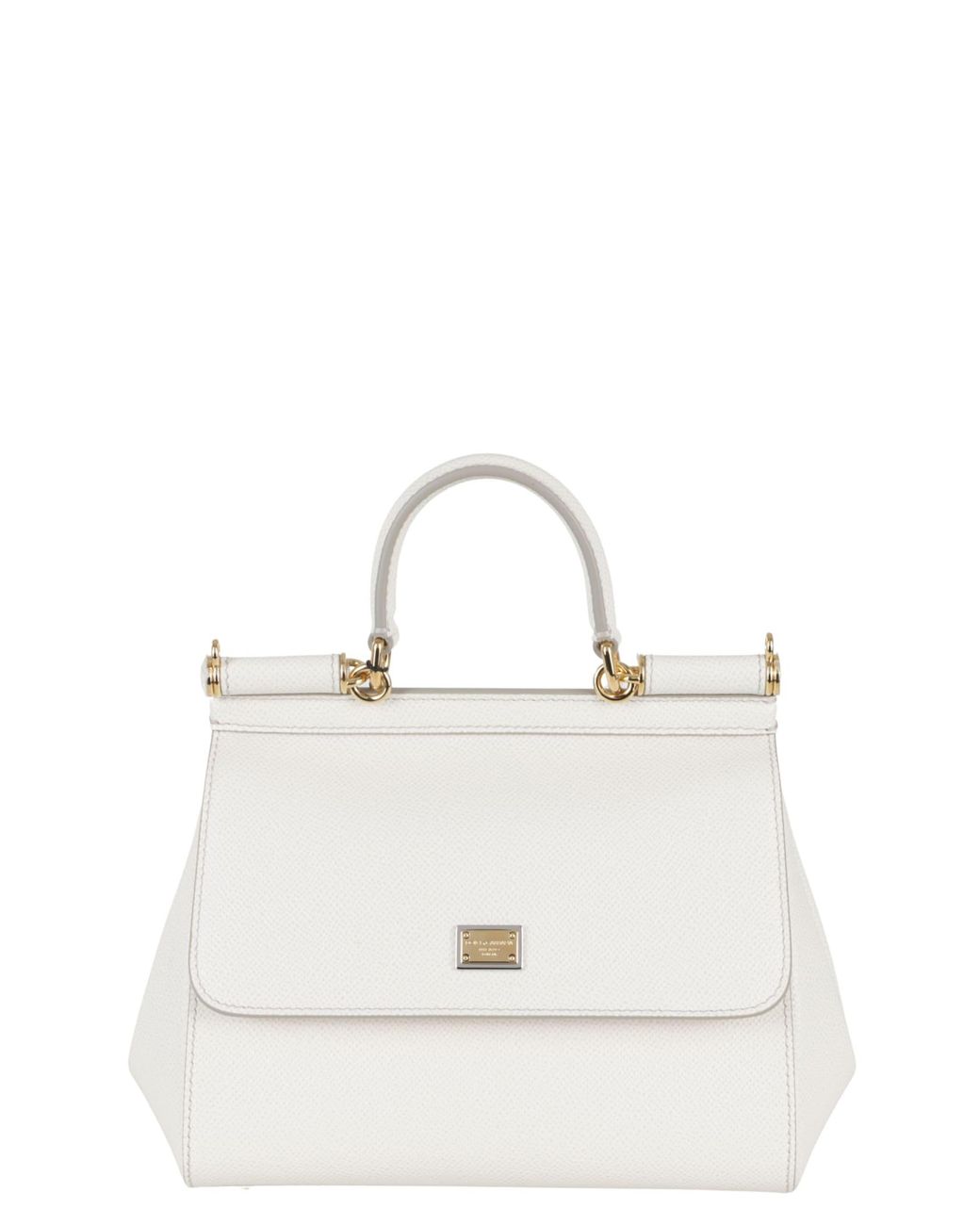 Category: Bags Item: Medium Sicily Brand: Dolce & Gabbana Color: White Details: On-top handle and adjustable, removable shoulder strap in Dauphine calfskin leather Closure: Tuck-in closure SIZE & FIT Width: 20 cm Height: 18. 5 cm Depth: 10 cm