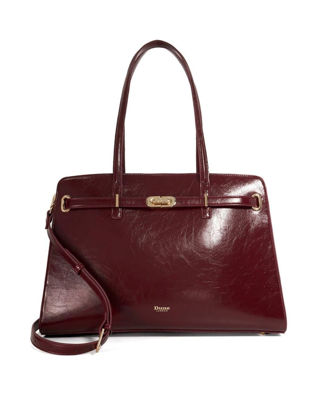 Keep your essentials organized and secure in this triple-compartment tote expertly made from textured leather. 10 1/2" x 16" x 6" 10 1/4” handle drop Magnetic closure Top carry handles; removable, adjustable crossbody strap Removable card case Protective metal feet Leather Imported Color: red