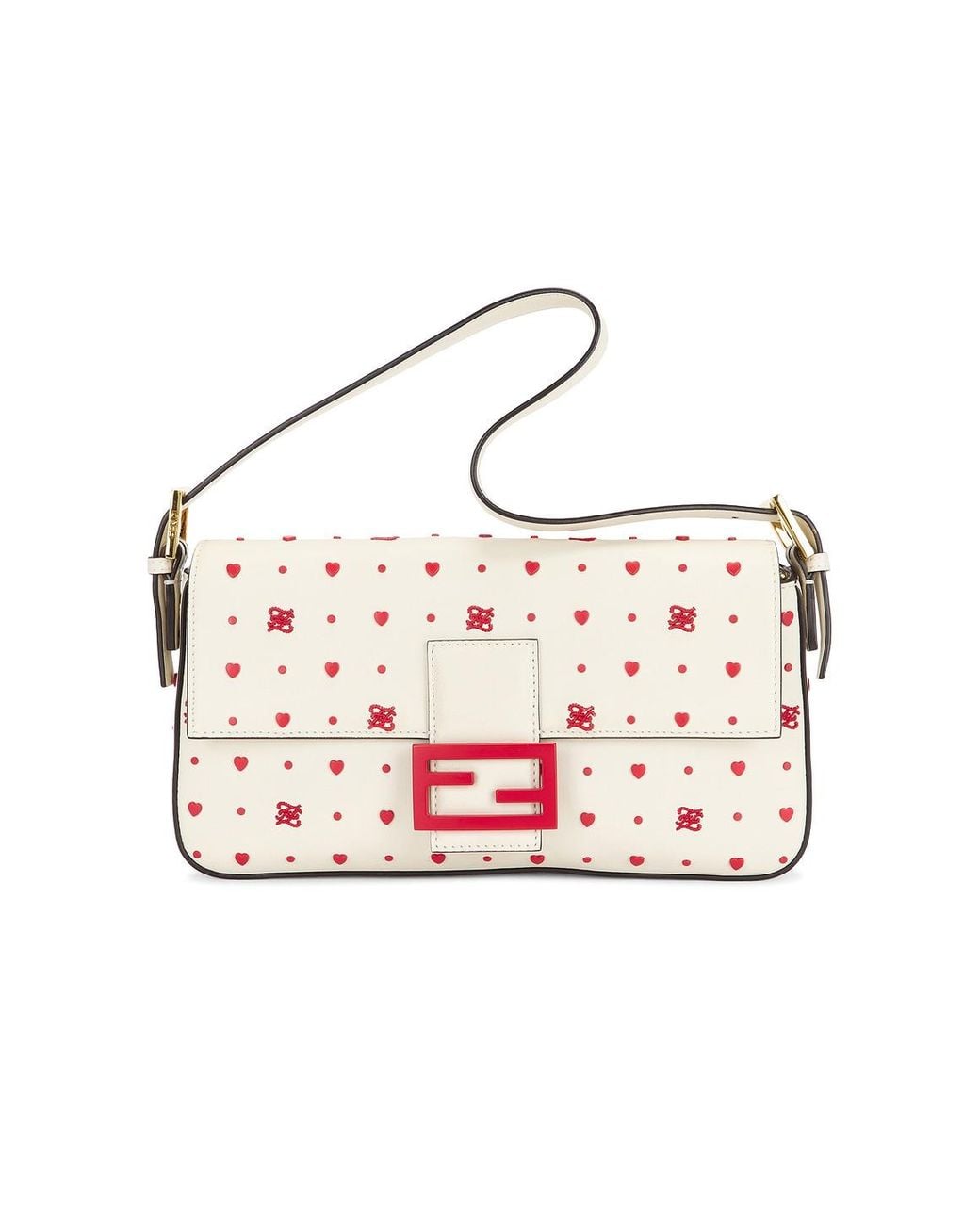 Fendi Chinese Valentine's Day Karligraphy Baguette 1997 Shoulder Bag in White White calfskin leather exterior with canvas lining, gold-tone hardware and red matte hardware. Made in Italy. Magnetic snap closure. One main compartment. 1 interior zip pocket. Original removable strap and brand dustbag included. Measures approx 10 W x 5 H x 1.5 D Shoulder strap with a 8 drop. Good. Light wear throughout. Original brand box, authenticity card, and hang tag not included. FNEF-WY7647. 12957890. About the designer: Color: white