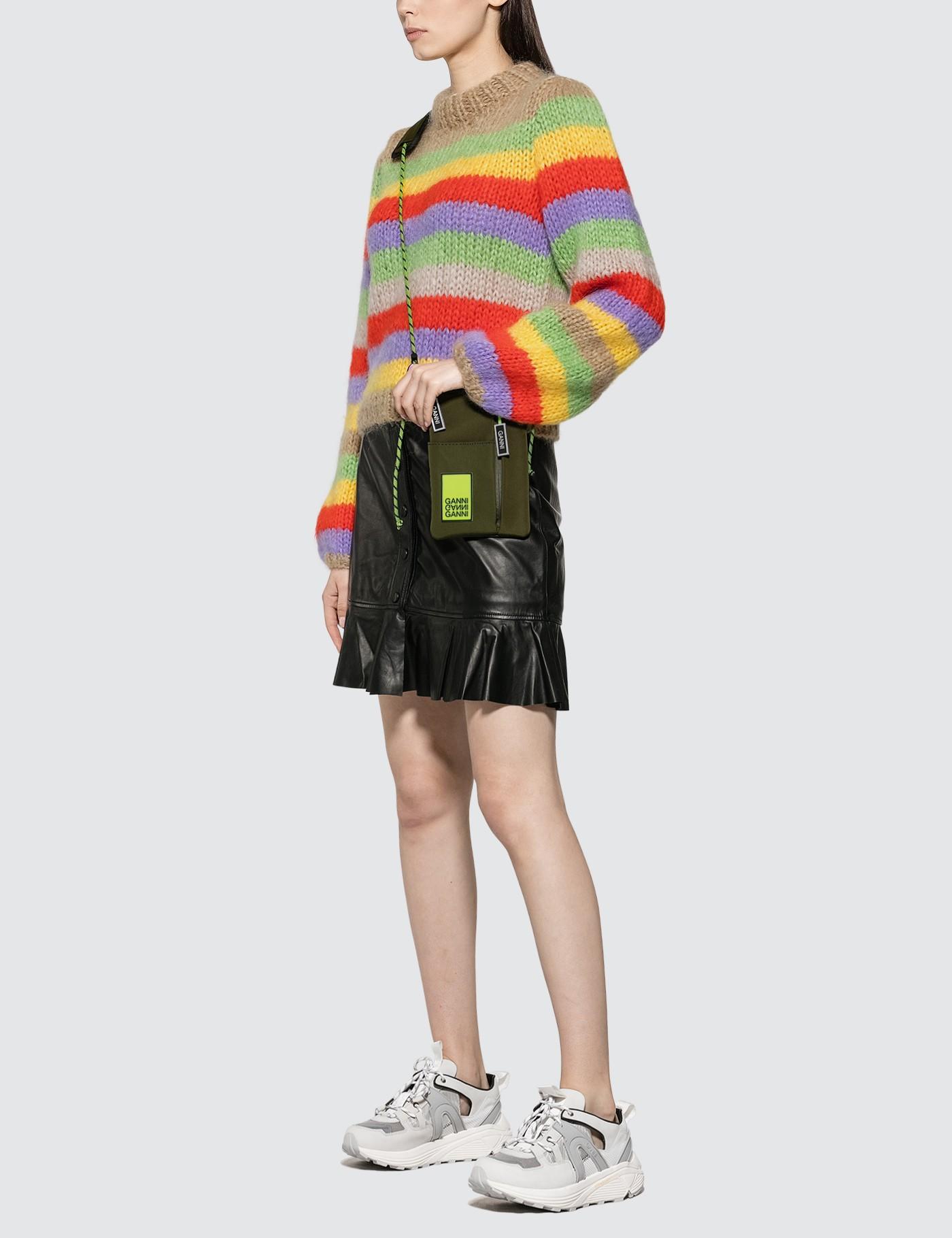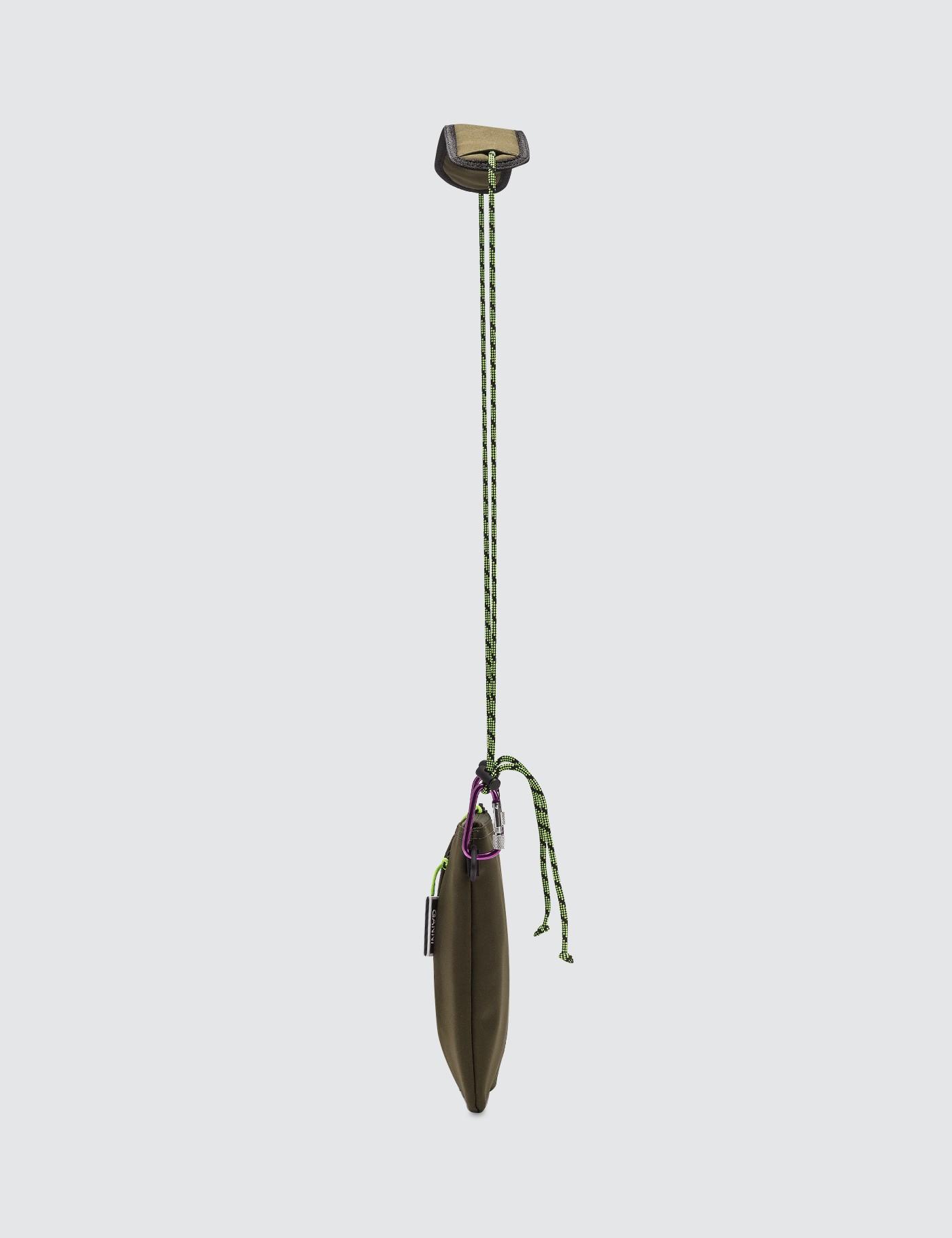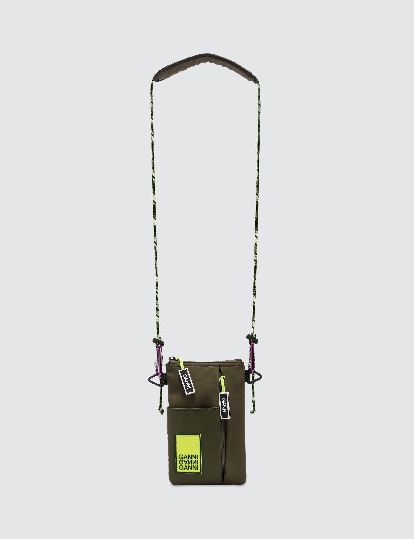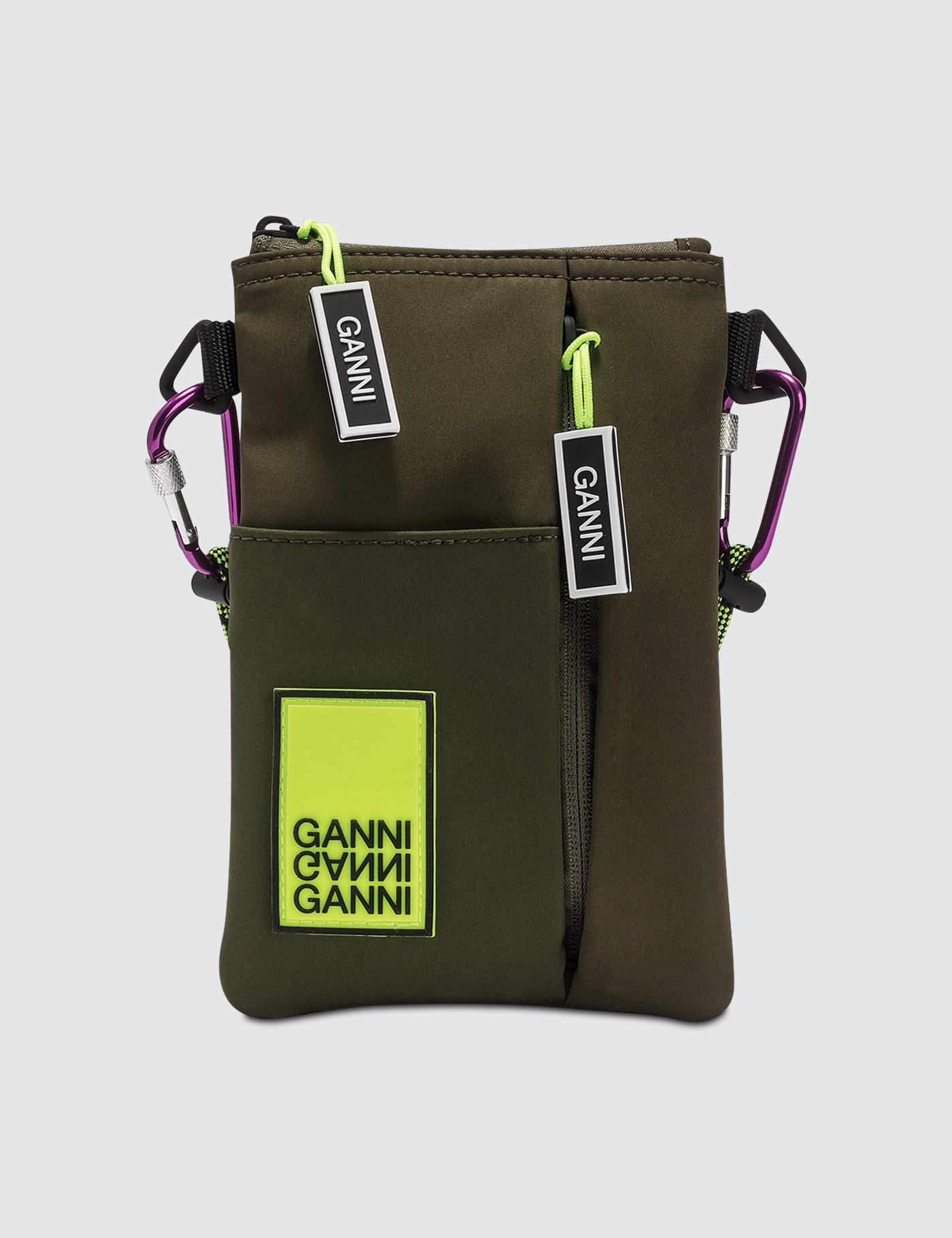 Ganni - Azalea Bags- Main compartment with top zip fastening - Rubberized logo patch in Neon Yellow on front - One zip pocket and one open pocket on front- Branded zipper - Removable fabric shoulder strap - Color: Khaki Green- 100% Polyester.