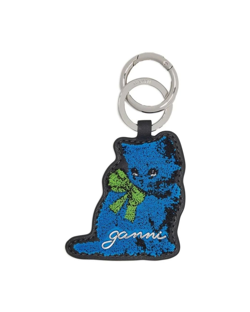 Ganni Kitty Keyring is a playful, animal-shaped accessory designed to add character to keys and bags. It features a durable leather charm with a silver-tone keyring and clasp for easy attachment. Key attributes: Blue | Leather | Silver-tone keyring and clasp | Cat-shaped charm | Ganni logo detail | Composition & care: 65% leather | 19% polyurethane fiber | 16% polyester | Do not wash. Do not bleach. Do not tumble dry. Do not iron. Do not dry clean. Color: blue
