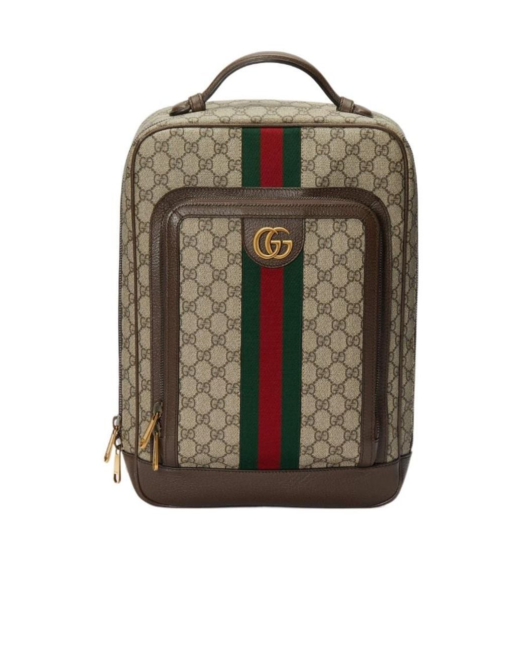 Beige and ebony GG Supreme canvas Brown leather trim Gold hardware Green and red net Cotton and linen lining Double G Front zipper pocket Top handle Zipper seal